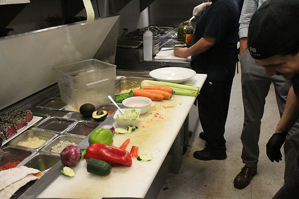 Onions, peppers, carrots, and celery are all cut up for use in salads and sandwiches.